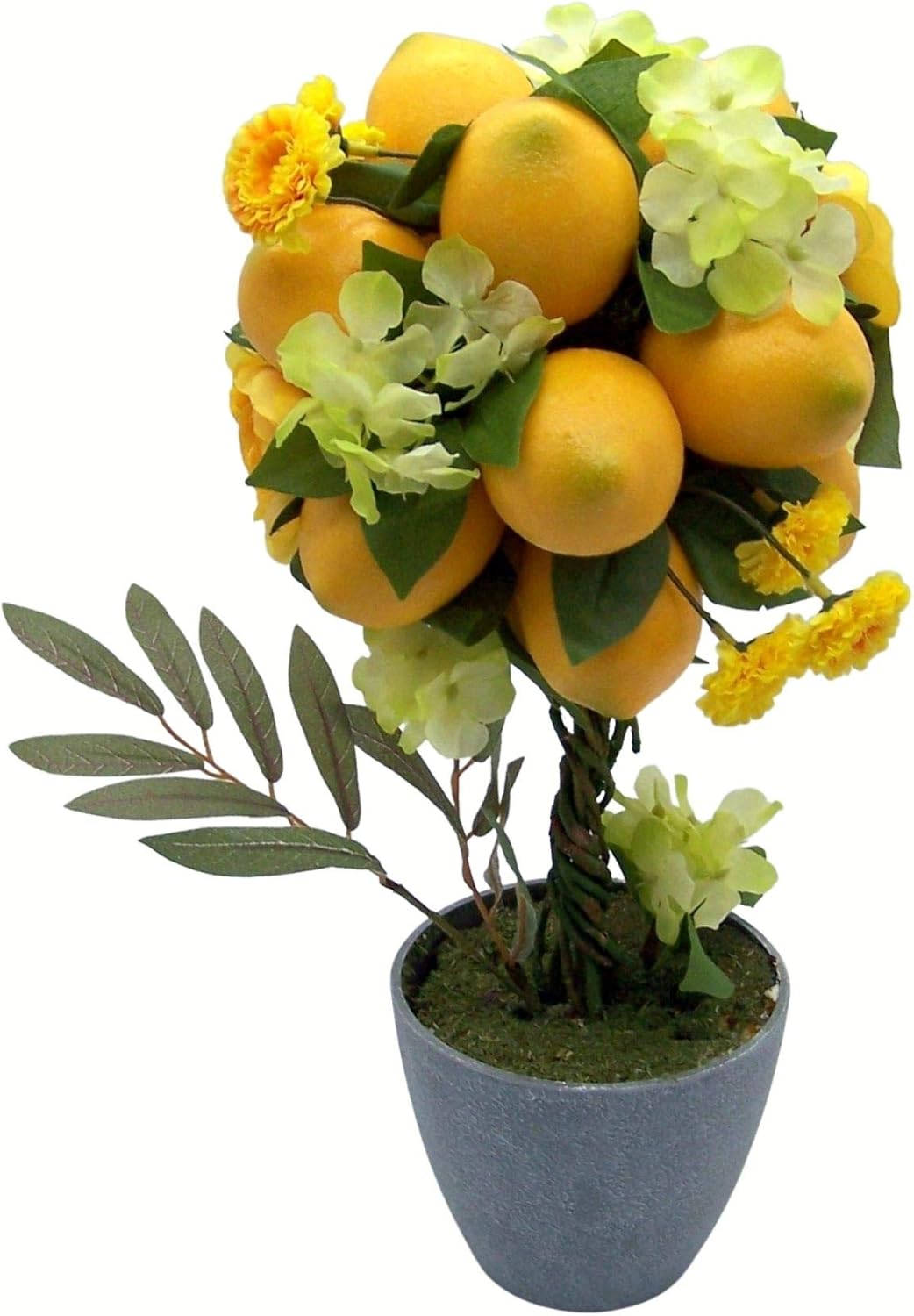 Adorable Artificial Potted Lemon Tree in a Grey Planter with Bright Yellow Flowers and Lush Greenery Material: Plastic, Foam, Fabric Size: 8.5"Dia x 16"H Freestanding to Easily Be Placed on a Table, Shelf, Desk or Mantle Perfect Compliment to Bright, Sunny Home Décor