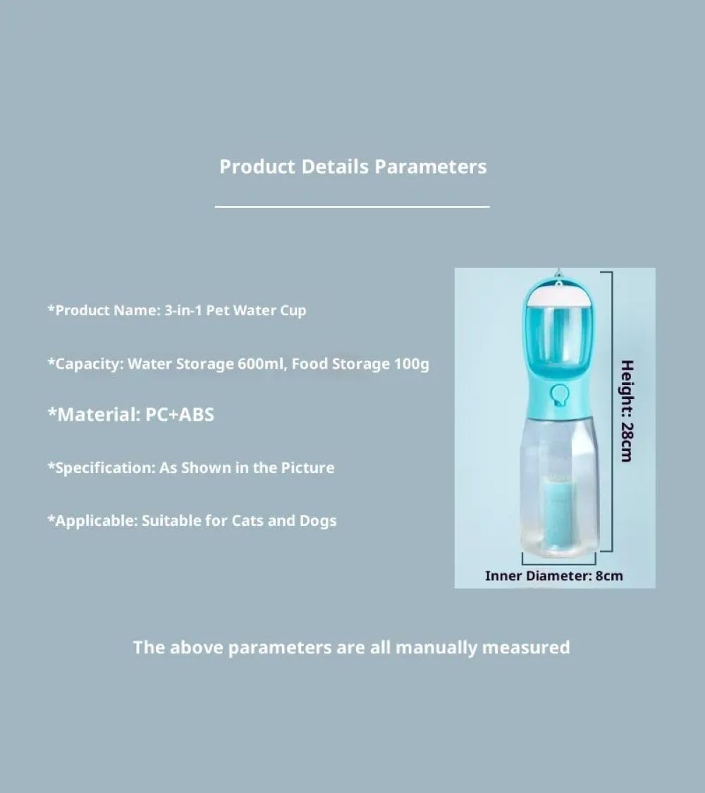 Experience ultimate convenience with this 3-in-1 Pet Travel Bottle, designed for pet owners on the move. This compact, all-in-one solution features a 600ml (20 oz) water dispenser , a 100g food container, and a handy waste bag compartment, consolidating your pet's essentials into a single item. Prioritizing your pet's health, the water dispenser is equipped with a built-in filtration system to ensure they always have access to clean, fresh drinking water, free of impurities, wherever your adventures take you. The bottle is also built for reliability: the lockable dispensing button gives you precise control over water flow, effectively preventing spills and leaks during walks, hikes, or car rides. Finally, the integrated waste bag compartment makes cleanup simple and hygienic, keeping your surroundings tidy. (Includes 1 Roll of poop bag) Please note that Food and Water shown in picture are for illustrations purpose and are not included in the package