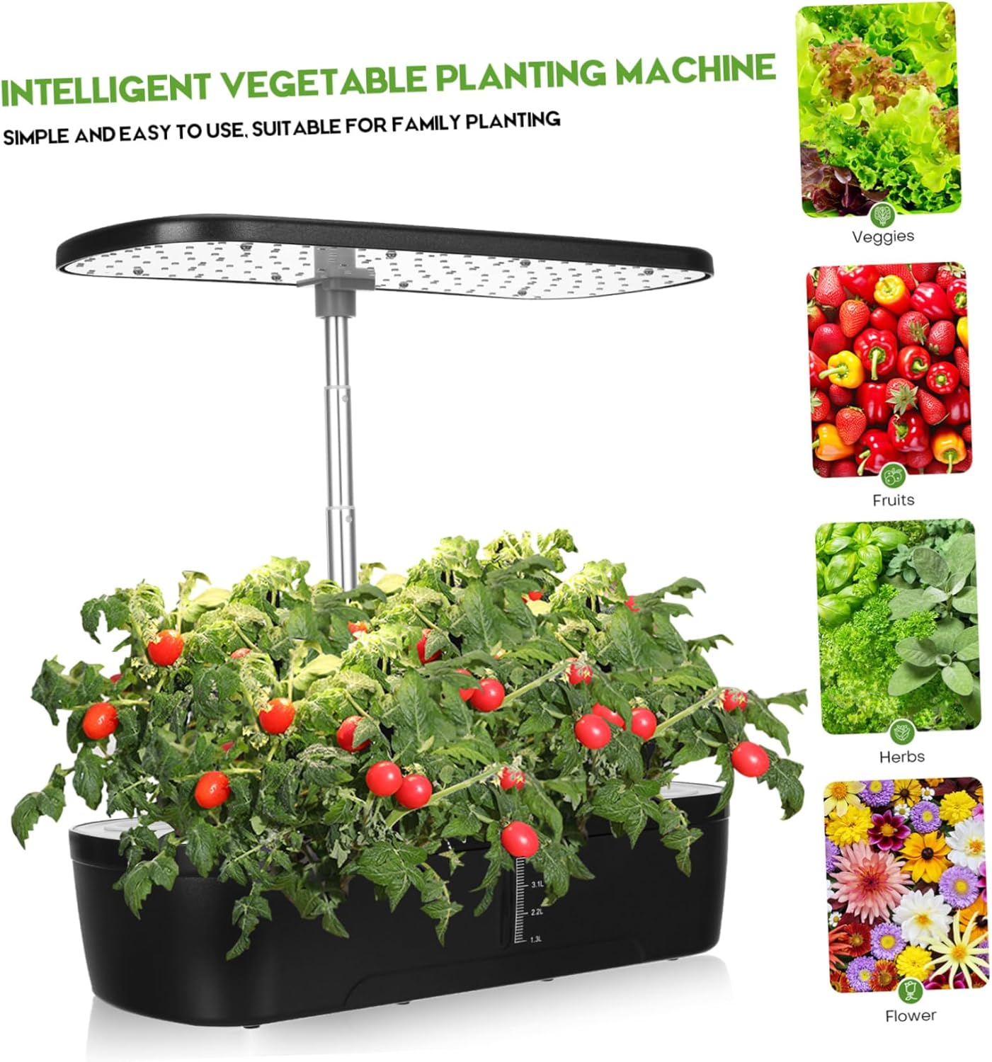 Package List 1 x vegetable planter 1 x adapter 12 x 12 x lids 2 x solid fertilizer 1 x instruction manual Characteristics - Space-Saving: The hydroponic planting compact and space-saving, making it ideal for small apartments or homes small hydroponics growing system - Abundant Accessories: The hydroponic planting system comes with planting , covers, and other accessories indoor growing kit -Size:39.00X19.00X17.50cm/15.33X7.47X6.88in grow kits - With Light: Equipped with supplementary light, the indoor garden allows that plants receive sufficient light for healthy growth indoor gardening system -Material:Plastic hydroponics growing kits - Easy to Use: The hydroponic growing easy to use, making it suitable for home gardening enthusiasts of all skill levels aquaponics growing system -Color:Black indoor garden hydroponic growing system -Voltage: AC100V-AC240V indoor grow kit -Power: 20W hydroponic grow kit -Number of pores: 12 indoor hydroponics system - Indoor Gardening: The plant growing kit is suitable for indoor gardening, allowing you to grow vegetables in your house indoor hydroponic system.Goods Descriptionhydroponic growing systems Built to last, our plant grow kit includes all the necessary accessories such as planting .hydroponic growing kit Note: This item comes with US plug, please confirm the voltage of your area before purchasing.hydroponic growing system kit With intelligent controls, you can watering, fertilizing, and temperature regulation, making it easy to maintain your indoor garden.indoor vegetable growing system Upgrade your indoor gardening with our hydroponic planting system