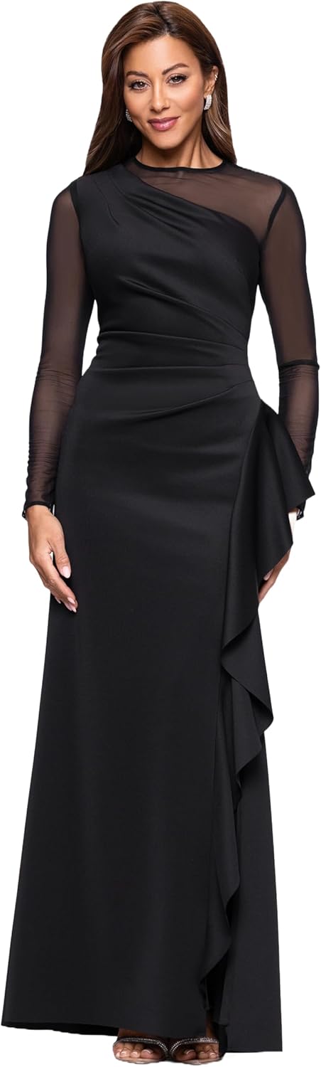 Xscape scuba crepe dress with illusion neckline, sheer mesh long sleeves, and flattering ruched bodice. Floor-length silhouette with cascading side ruffle and back zip closure, perfect for weddings, galas, parties, and sophisticated black-tie occasions.
