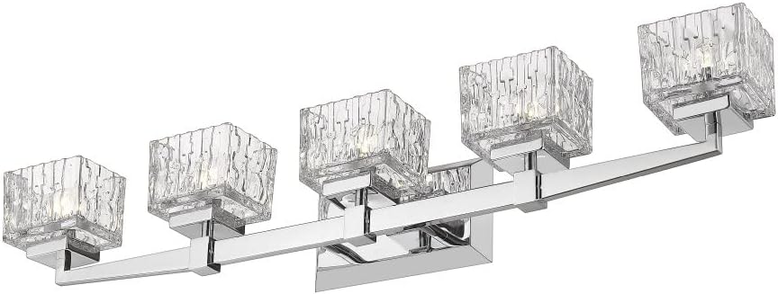 This chrome finish five-light vanity light energizes a contemporary bath space. Take advantage of a tasteful Art Deco inspired silhouette and the beautiful pairing of chrome steel and clear glass.